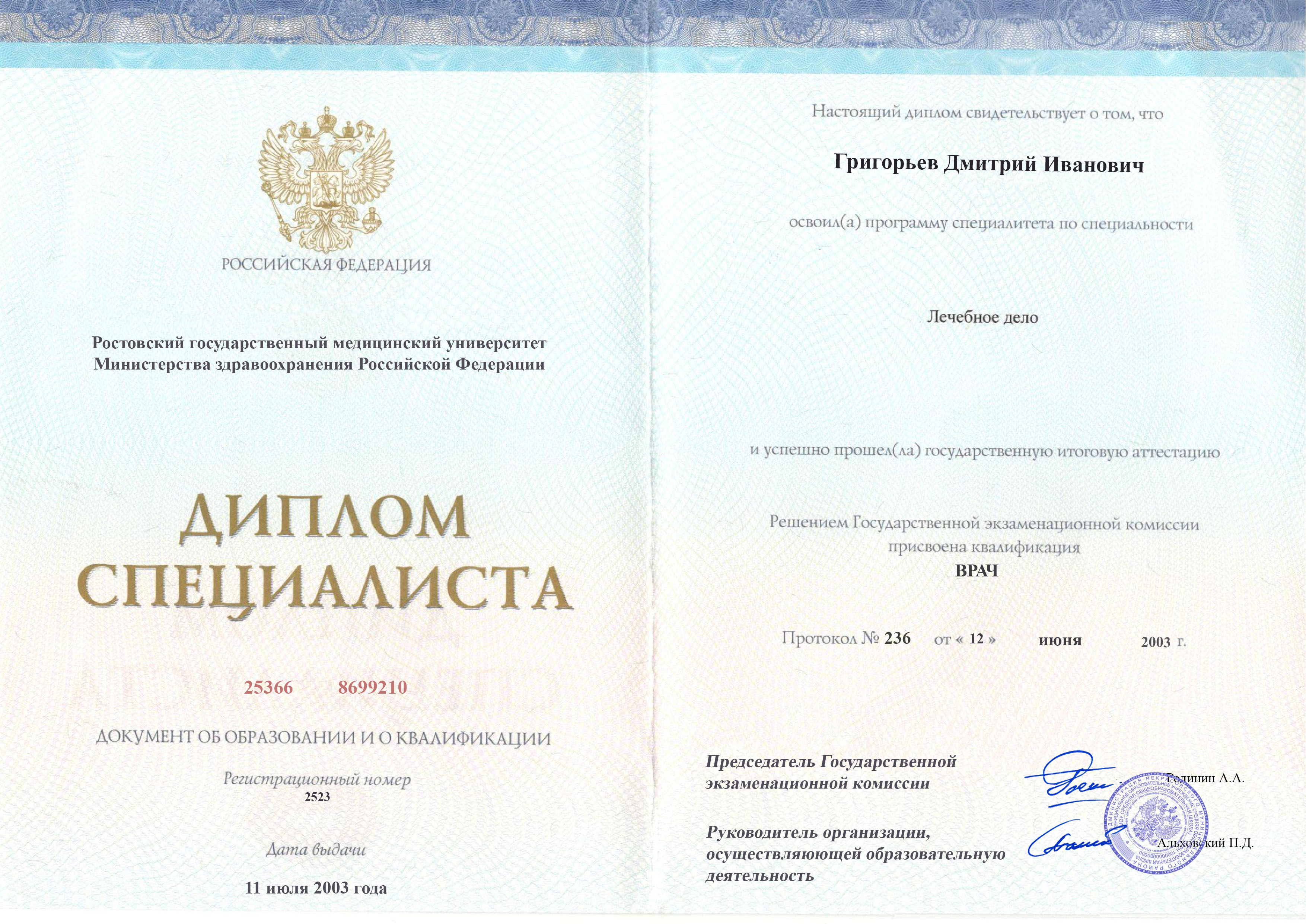 Диплом специалиста Григорьева Дмитрия Ивановича